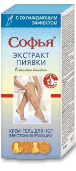 Крем-гель для ног СОФЬЯ. Экстракт пиявки охлаждающий - натуральное эффективное средство для профилактики венозной недостаточности и варикозной болезни ног. Оказывает венотонизирующее и противоотечное действие, уменьшает венозный застой, снижает проницаемость вен, ломкость капилляров, улучшает микроциркуляцию и лимфоотток, снижает риск возникновения трофических изменений кожи. Благодаря выраженому охлаждающему эффекту, возвращает ногам комфортное чувство легкости и прохлады, снижает болезненные проявления, снимает усталость и тяжесть в ногах, способствует расслаблению мышц.